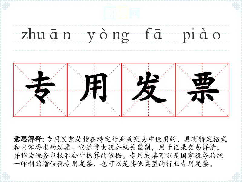 “专用发票”是一个在商业和税务领域非常重要的词汇。它不仅代表了交易的正式性和合法性,也是国家税务管理的重要组成部分。在我的语言学*和表达中,理解和正确使用这个词汇对于准确传达商业和税务相关的信息至关重要。