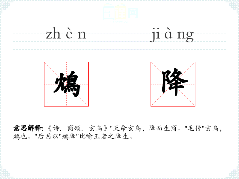 《诗.商颂.玄鸟》"天命玄鸟,降而生商。"毛传"玄鸟,鴆也。"后因以"鴆降"比喻王者之降生。