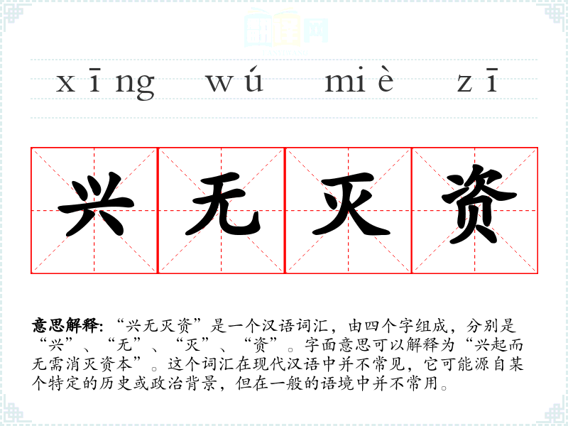 “兴无灭资”是一个汉语词汇,由四个字组成,分别是“兴”、“无”、“灭”、“资”。字面意思可以解释为“兴起而无需消灭资本”。这个词汇在现代汉语中并不常见,它可能源自某个特定的历史或政治背景,但在一般的语境中并不常用。