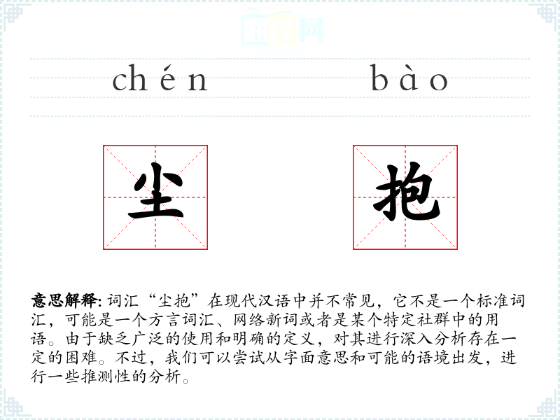词汇“尘抱”在现代汉语中并不常见,它不是一个标准词汇,可能是一个方言词汇、网络新词或者是某个特定社群中的用语。由于缺乏广泛的使用和明确的定义,对其进行深入分析存在一定的困难。不过,我们可以尝试从字面意思和可能的语境出发,进行一些推测性的分析。