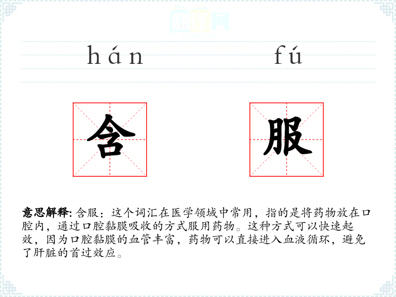 含服:这个词汇在医学领域中常用,指的是将药物放在口腔内,通过口腔黏膜吸收的方式服用药物。这种方式可以快速起效,因为口腔黏膜的血管丰富,药物可以直接进入血液循环,避免了肝脏的首过效应。