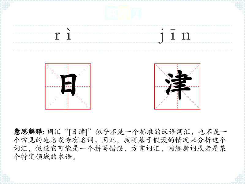 由于“[日津]”不是一个已知词汇,对其的理解和应用需要基于假设和创造性思维。在语言学*和表达中,理解和使用新词汇或非常规词汇可以丰富语言的表达能力。