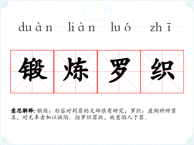 锻炼:形容对判罪的文辞很有研究;罗织:虚构种种罪名,对无辜者加以诬陷。指罗织罪状,故意陷人于罪。