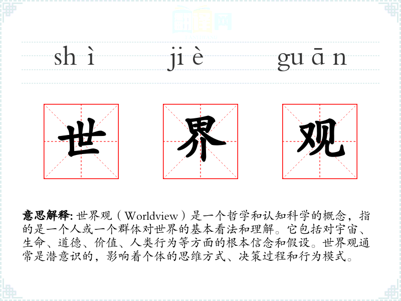 世界观(Worldview)是一个哲学和认知科学的概念,指的是一个人或一个群体对世界的基本看法和理解。它包括对宇宙、生命、道德、价值、人类行为等方面的根本信念和假设。世界观通常是潜意识的,影响着个体的思维方式、决策过程和行为模式。