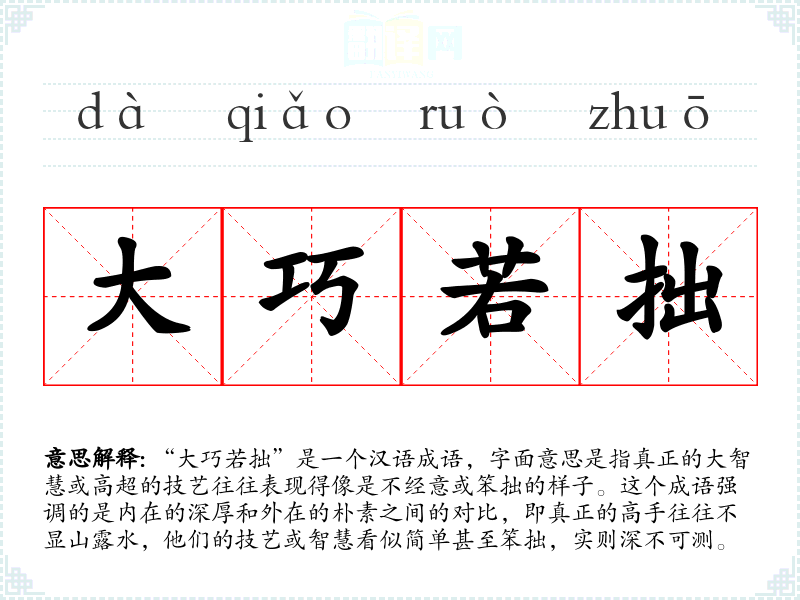 “大巧若拙”是一个汉语成语,字面意思是指真正的大智慧或高超的技艺往往表现得像是不经意或笨拙的样子。这个成语强调的是内在的深厚和外在的朴素之间的对比,即真正的高手往往不显山露水,他们的技艺或智慧看似简单甚至笨拙,实则深不可测。