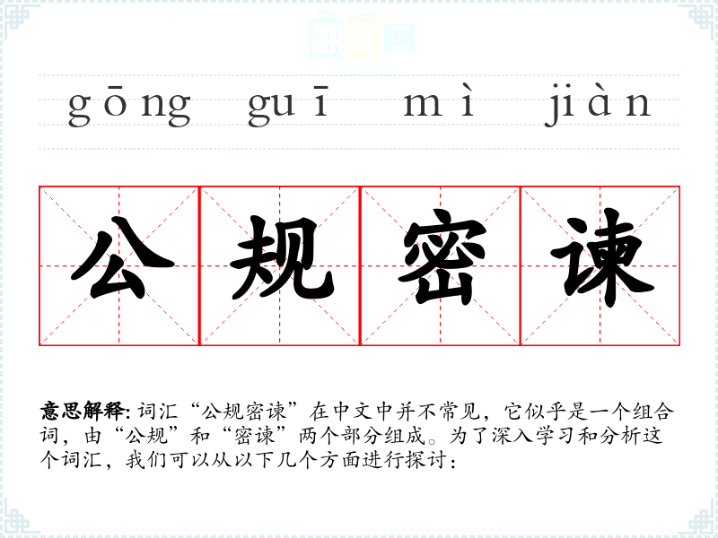 词汇“公规密谏”在中文中并不常见,它似乎是一个组合词,由“公规”和“密谏”两个部分组成。为了深入学*和分析这个词汇,我们可以从以下几个方面进行探讨: