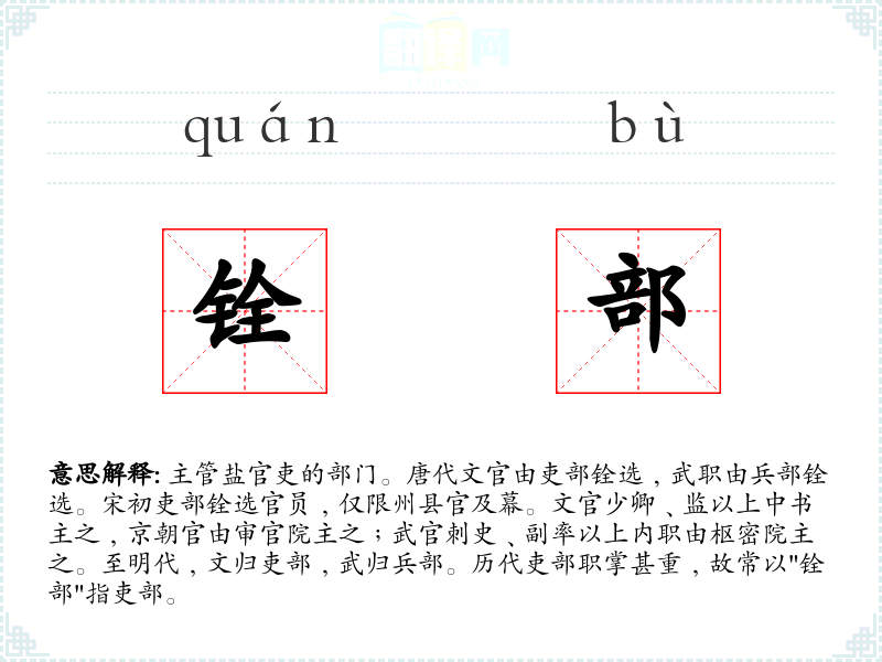 1.主管盐官吏的部门。唐代文官由吏部铨选﹐武职由兵部铨选。宋初吏部铨选官员﹐仅限州县官及幕。文官少卿﹑监以上中书主之﹐京朝官由审官院主之﹔武官刺史﹑副率以上内职由枢密院主之。至明代﹐文归吏部﹐武归兵部。历代吏部职掌甚重﹐故常以"铨部"指吏部。