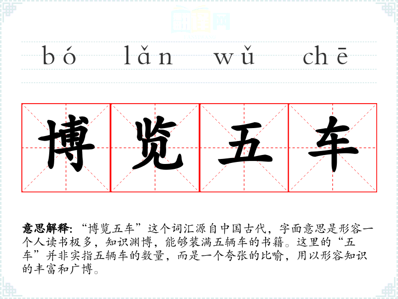 “博览五车”这个词汇源自**古代,字面意思是形容一个人读书极多,知识渊博,能够装满五辆车的书籍。这里的“五车”并非实指五辆车的数量,而是一个夸张的比喻,用以形容知识的丰富和广博。