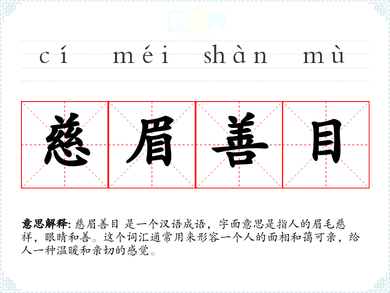 慈眉善目 是一个汉语成语,字面意思是指人的眉毛慈祥,眼睛和善。这个词汇通常用来形容一个人的面相和蔼可亲,给人一种温暖和亲切的感觉。