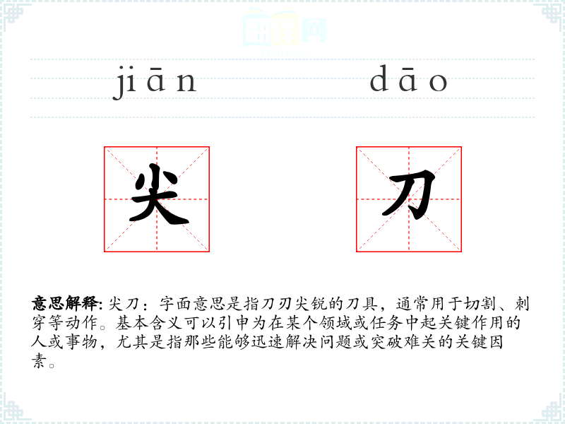 尖刀:字面意思是指刀刃尖锐的刀具,通常用于切割、刺穿等动作。基本含义可以引申为在某个领域或任务中起关键作用的人或事物,尤其是指那些能够迅速解决问题或突破难关的关键因素。