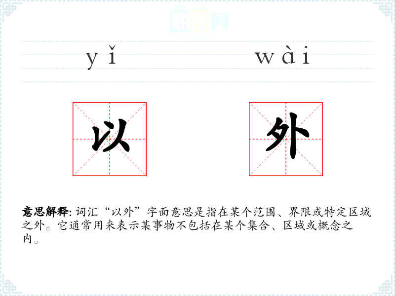 词汇“以外”字面意思是指在某个范围、界限或特定区域之外。它通常用来表示某事物不包括在某个集合、区域或概念之内。