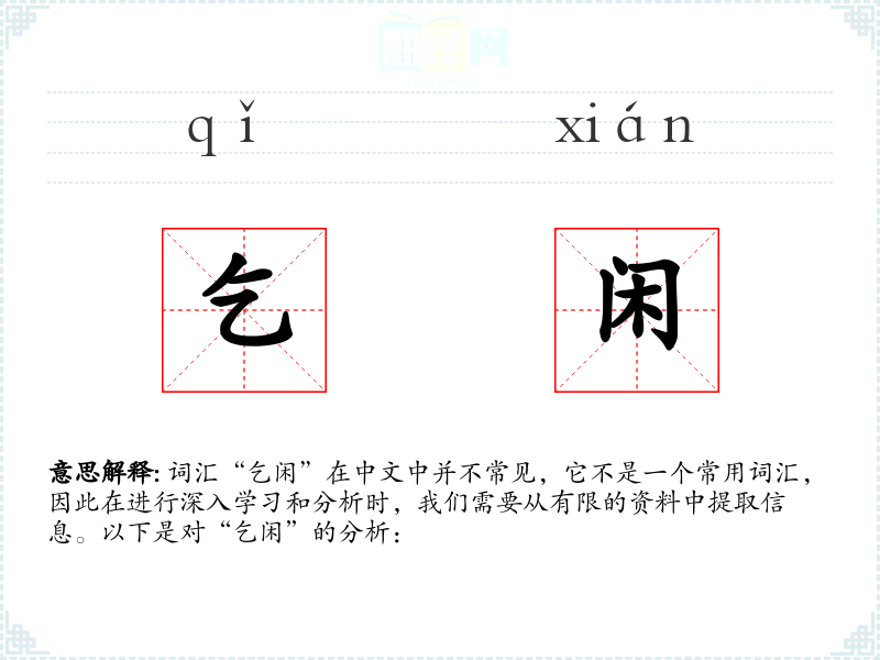 词汇“乞闲”在中文中并不常见,它不是一个常用词汇,因此在进行深入学习和分析时,我们需要从有限的资料中提取信息。以下是对“乞闲”的分析: