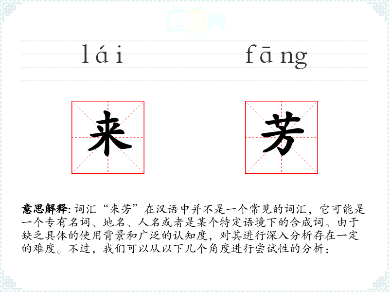 由于“来芳”不是一个标准词汇,我们无法给出一个确切的基本定义。它可能是由“来”和“芳”两个字组合而成的,其中“来”通常表示到来、出现,而“芳”则常指芳香、美好的事物。因此,“来芳”可能隐含着“带来芳香”或“出现美好”的意味。
