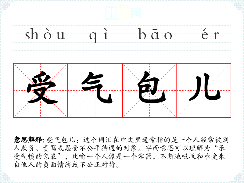 受气包儿:这个词汇在中文里通常指的是一个人经常被别人欺负、责骂或忍受不公平待遇的对象。字面意思可以理解为“承受气愤的包裹”,比喻一个人像是一个容器,不断地吸收和承受来自他人的负面情绪或不公正对待。