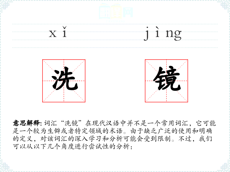 - 反义词:(由于“洗镜”不是一个常用词汇,反义词可能不明显)