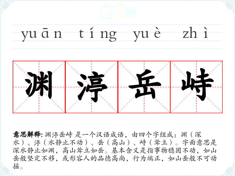 渊渟岳峙 是一个汉语成语,由四个字组成:渊(深水)、渟(水静止不动)、岳(高山)、峙(耸立)。字面意思是深水静止如渊,高山耸立如岳。基本含义是指事物稳固不动,如山岳般坚定不移,或形容人的品德高尚,行为端正,如山岳般不可动摇。