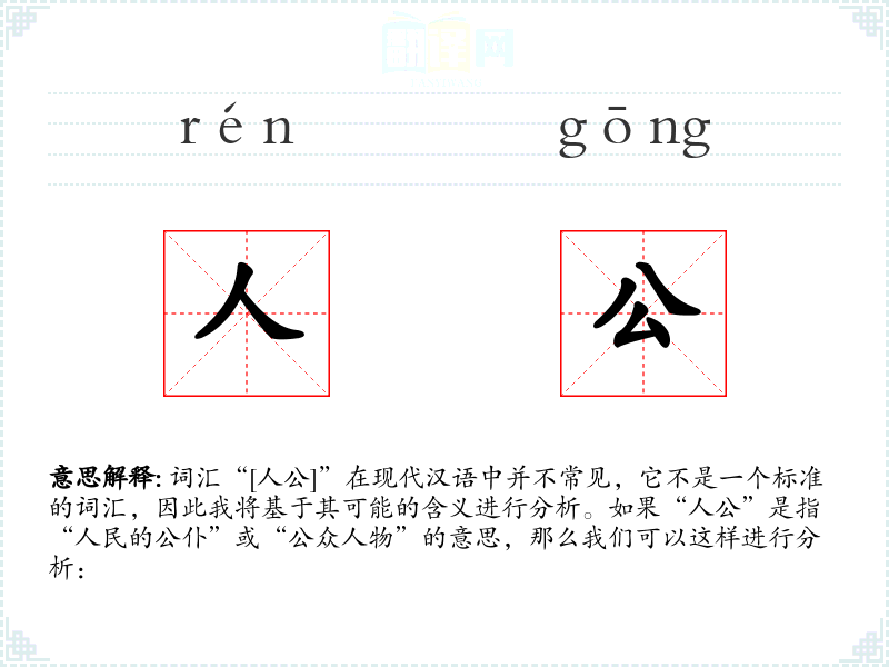 由于“人公”不是一个常用词汇,上述分析基于其可能的含义进行。如果“人公”有其他特定的含义或用法,请提供更多信息以便进行更准确的分析。