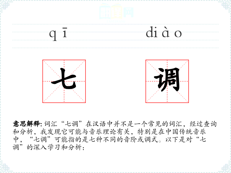 词汇“七调”在汉语中并不是一个常见的词汇,经过查询和分析,我发现它可能与音乐理论有关,特别是在*传统音乐中,“七调”可能指的是七种不同的音阶或调式。以下是对“七调”的深入学和分析: