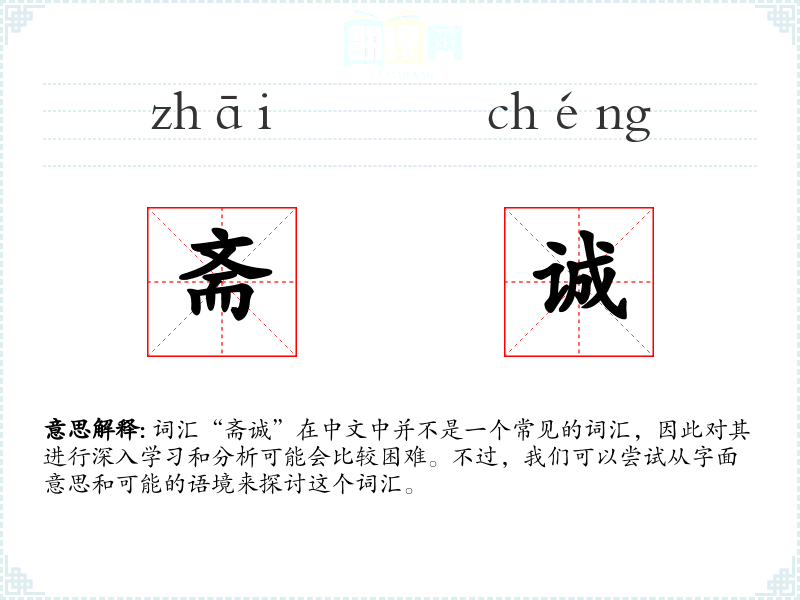 词汇“斋诚”在中文中并不是一个常见的词汇,因此对其进行深入学*和分析可能会比较困难。不过,我们可以尝试从字面意思和可能的语境来探讨这个词汇。