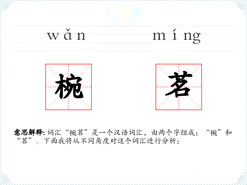 词汇“椀茗”是一个汉语词汇,由两个字组成:“椀”和“茗”。下面我将从不同角度对这个词汇进行分析: