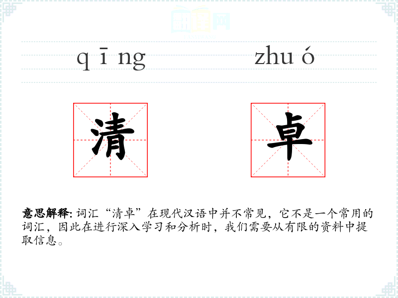 词汇“清卓”在现代汉语中并不常见,它不是一个常用的词汇,因此在进行深入学*和分析时,我们需要从有限的资料中提取信息。
