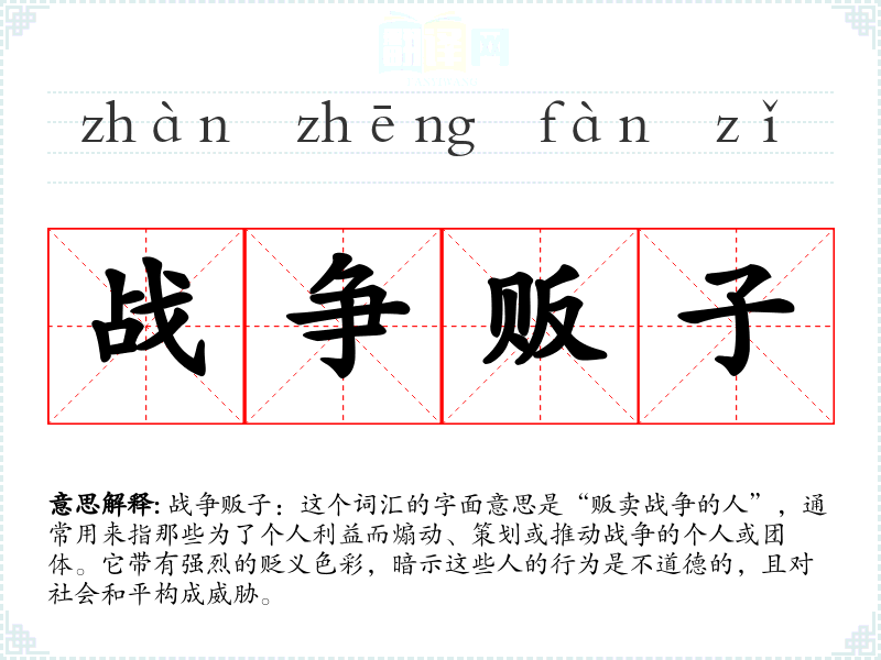 战争贩子:这个词汇的字面意思是“贩卖战争的人”,通常用来指那些为了个人利益而煽动、策划或推动战争的个人或团体。它带有强烈的贬义色彩,暗示这些人的行为是不道德的,且对社会和平构成威胁。
