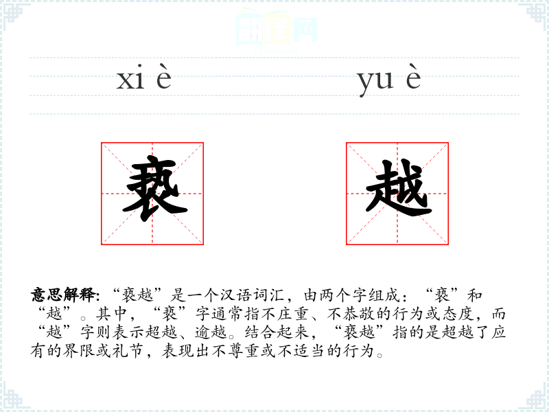 “亵”字最早见于《说文解字》,原意为内衣,引申为不庄重、不恭敬。“越”字则有超越、逾越之意。两个字结合后,“亵越”成为一个复合词,用来描述超越界限的不当行为。