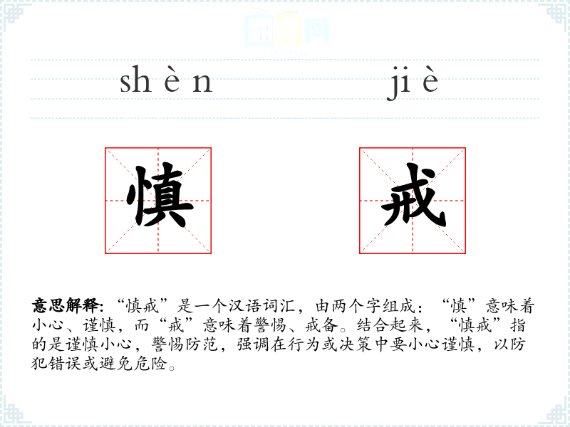 “慎戒”这个词给人一种稳重和可靠的感觉,它让人联想到深思熟虑和周密计划。在情感上,它可能引发一种安心感,因为知道有人在谨慎地处理问题。