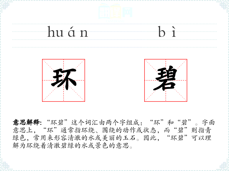 “环碧”这个词汇由两个字组成:“环”和“碧”。字面意思上,“环”通常指环绕、围绕的动作或状态,而“碧”则指青绿色,常用来形容清澈的水或美丽的玉石。因此,“环碧”可以理解为环绕着清澈碧绿的水或景色的意思。