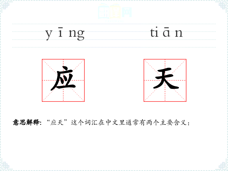 “应天”这个词不仅是一个词汇,更是一种文化和哲学的体现。它提醒我们在面对自然和社会规律时,应保持敬畏和顺应的态度。在语言学*和表达中,理解和运用“应天”可以帮助我们更好地把握**传统文化的精髓。