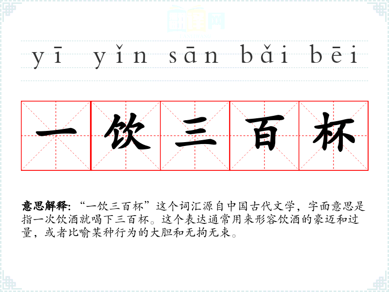 “一饮三百杯”这个词汇源自**古代文学,字面意思是指一次饮酒就喝下三百杯。这个表达通常用来形容饮酒的豪迈和过量,或者比喻某种行为的大胆和无拘无束。