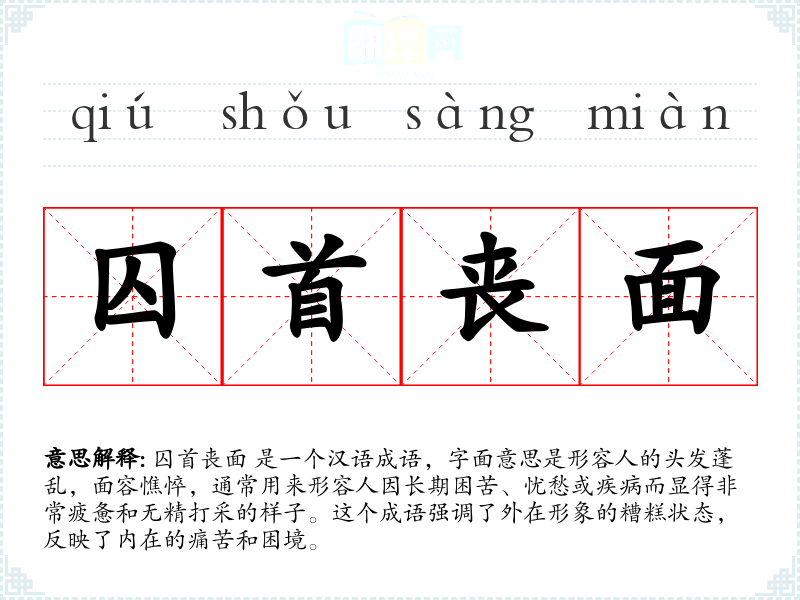 囚首丧面 是一个汉语成语,字面意思是形容人的头发蓬乱,面容憔悴,通常用来形容人因长期困苦、忧愁或疾病而显得非常疲惫和无精打采的样子。这个成语强调了外在形象的糟糕状态,反映了内在的痛苦和困境。