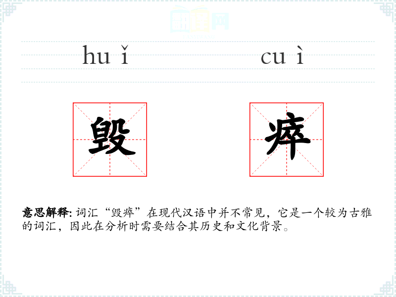 词汇“毁瘁”在现代汉语中并不常见,它是一个较为古雅的词汇,因此在分析时需要结合其历史和文化背景。