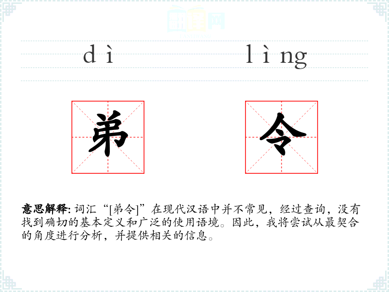 由于“[弟令]”不是一个标准的现代汉语词汇,我们无法提供确切的基本定义。它可能是一个方言词汇、古文词汇或者是某个特定社群中的术语。