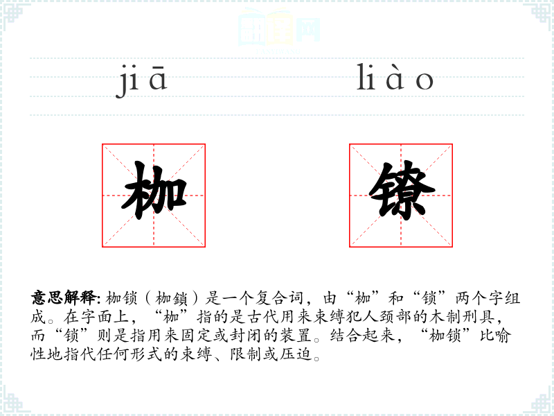 枷锁(枷鎖)是一个复合词,由“枷”和“锁”两个字组成。在字面上,“枷”指的是古代用来束缚犯人颈部的木制刑具,而“锁”则是指用来固定或封闭的装置。结合起来,“枷锁”比喻性地指代任何形式的束缚、限制或压迫。