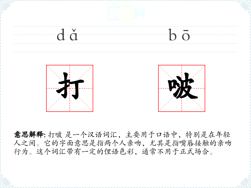 打啵 是一个汉语词汇,主要用于口语中,特别是在年轻人之间。它的字面意思是指两个人亲吻,尤其是指嘴唇接触的亲吻行为。这个词汇带有一定的俚语色彩,通常不用于正式场合。