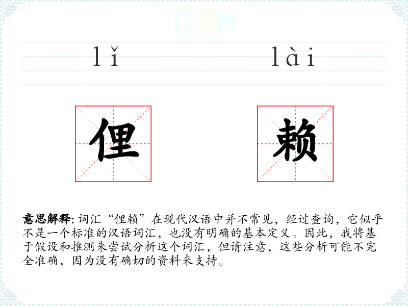 词汇“俚赖”在现代汉语中并不常见,经过查询,它似乎不是一个标准的汉语词汇,也没有明确的基本定义。因此,我将基于假设和推测来尝试分析这个词汇,但请注意,这些分析可能不完全准确,因为没有确切的资料来支持。