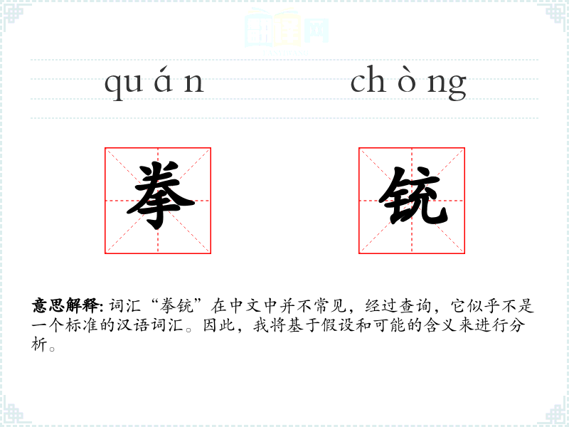 词汇“拳铳”在中文中并不常见,经过查询,它似乎不是一个标准的汉语词汇。因此,我将基于假设和可能的含义来进行分析。