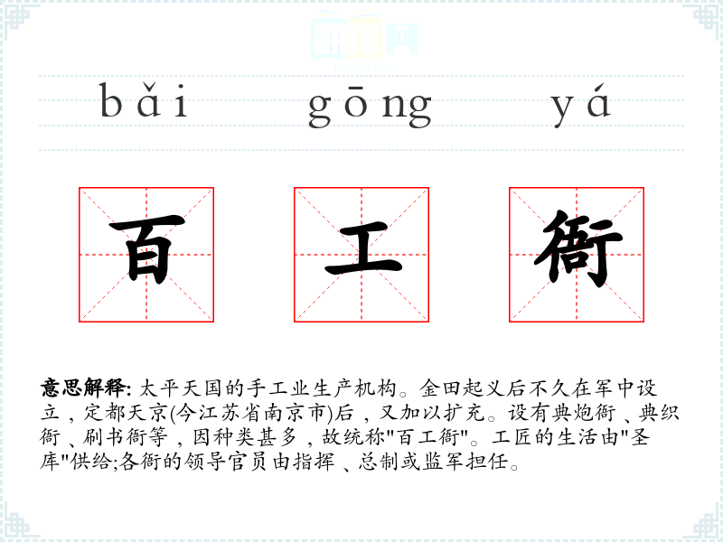 1.太平天国的手工业生产机构。金田起义后不久在军中设立﹐定都天京(今江苏省南京市)后﹐又加以扩充。设有典炮衙﹑典织衙﹑刷书衙等﹐因种类甚多﹐故统称"百工衙"。工匠的生活由"圣库"供给;各衙的领导官员由指挥﹑总制或监军担任。
