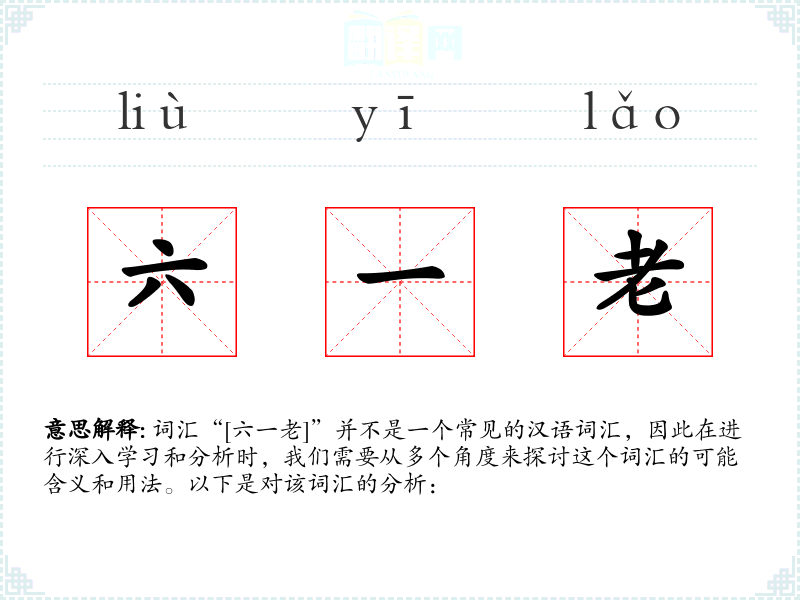 词汇“[六一老]”并不是一个常见的汉语词汇,因此在进行深入学习和分析时,我们需要从多个角度来探讨这个词汇的可能含义和用法。以下是对该词汇的分析:
