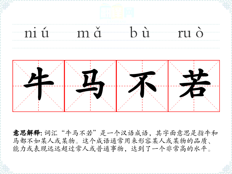 词汇“牛马不若”是一个汉语成语,其字面意思是指牛和马都不如某人或某物。这个成语通常用来形容某人或某物的品质、能力或表现远远超过常人或普通事物,达到了一个非常高的水平。