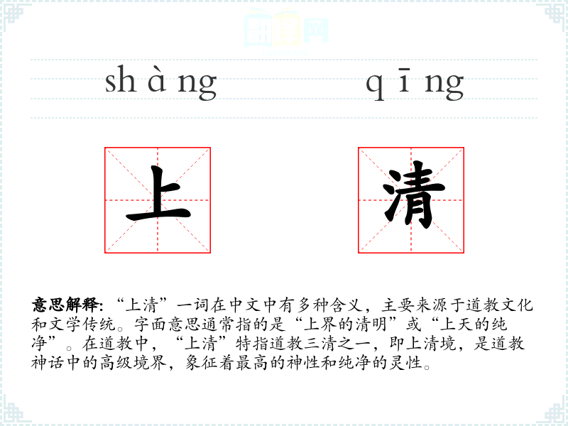“上清”一词在中文中有多种含义,主要来源于道教文化和文学传统。字面意思通常指的是“上界的清明”或“上天的纯净”。在道教中,“上清”特指道教三清之一,即上清境,是道教神话中的高级境界,象征着最高的神性和纯净的灵性。