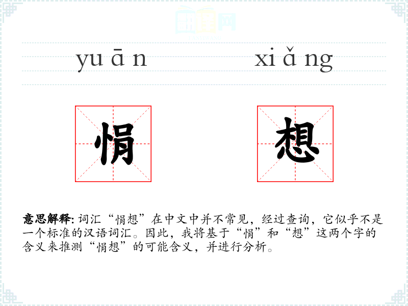词汇“悁想”在中文中并不常见,经过查询,它似乎不是一个标准的汉语词汇。因此,我将基于“悁”和“想”这两个字的含义来推测“悁想”的可能含义,并进行分析。