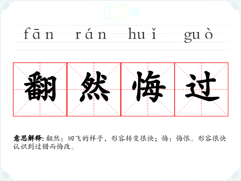翻然:回飞的样子,形容转变很快;悔:悔恨。形容很快认识到过错而悔改。