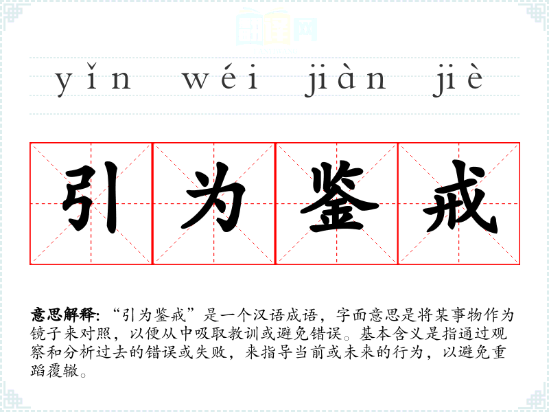 “引为鉴戒”是一个汉语成语,字面意思是将某事物作为镜子来对照,以便从中吸取教训或避免错误。基本含义是指通过观察和分析过去的错误或失败,来指导当前或未来的行为,以避免重蹈覆辙。