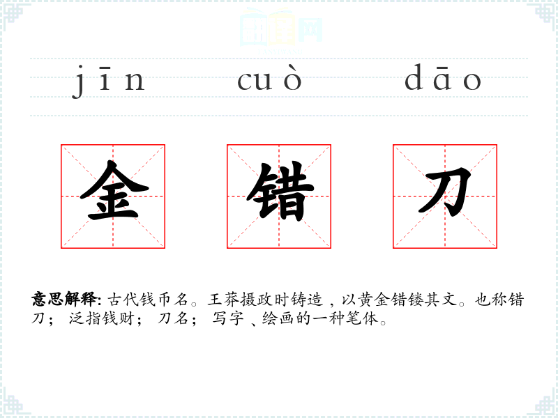 古代钱币名。王莽摄政时铸造﹐以黄金错镂其文。也称错刀; 泛指钱财; 刀名; 写字﹑绘画的一种笔体。
