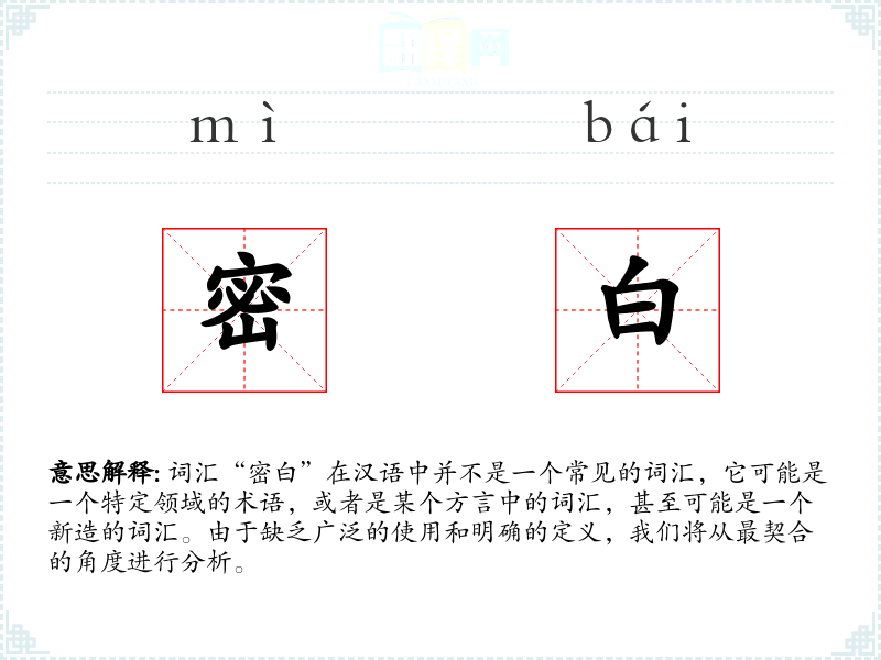 词汇“密白”在汉语中并不是一个常见的词汇,它可能是一个特定领域的术语,或者是某个方言中的词汇,甚至可能是一个新造的词汇。由于缺乏广泛的使用和明确的定义,我们将从最契合的角度进行分析。