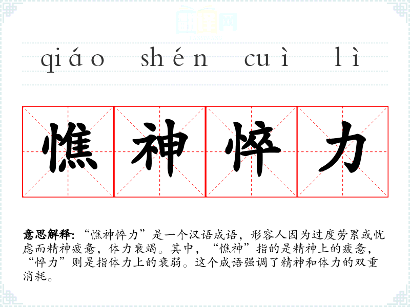 “憔神悴力”是一个汉语成语,形容人因为过度劳累或忧虑而精神疲惫,体力衰竭。其中,“憔神”指的是精神上的疲惫,“悴力”则是指体力上的衰弱。这个成语强调了精神和体力的双重消耗。