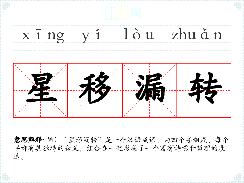 词汇“星移漏转”是一个汉语成语,由四个字组成,每个字都有其独特的含义,组合在一起形成了一个富有诗意和哲理的表达。
