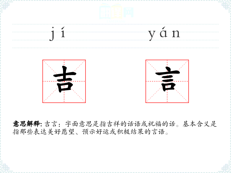 吉言:字面意思是指吉祥的话语或祝福的话。基本含义是指那些表达美好愿望、预示好运或积极结果的言语。